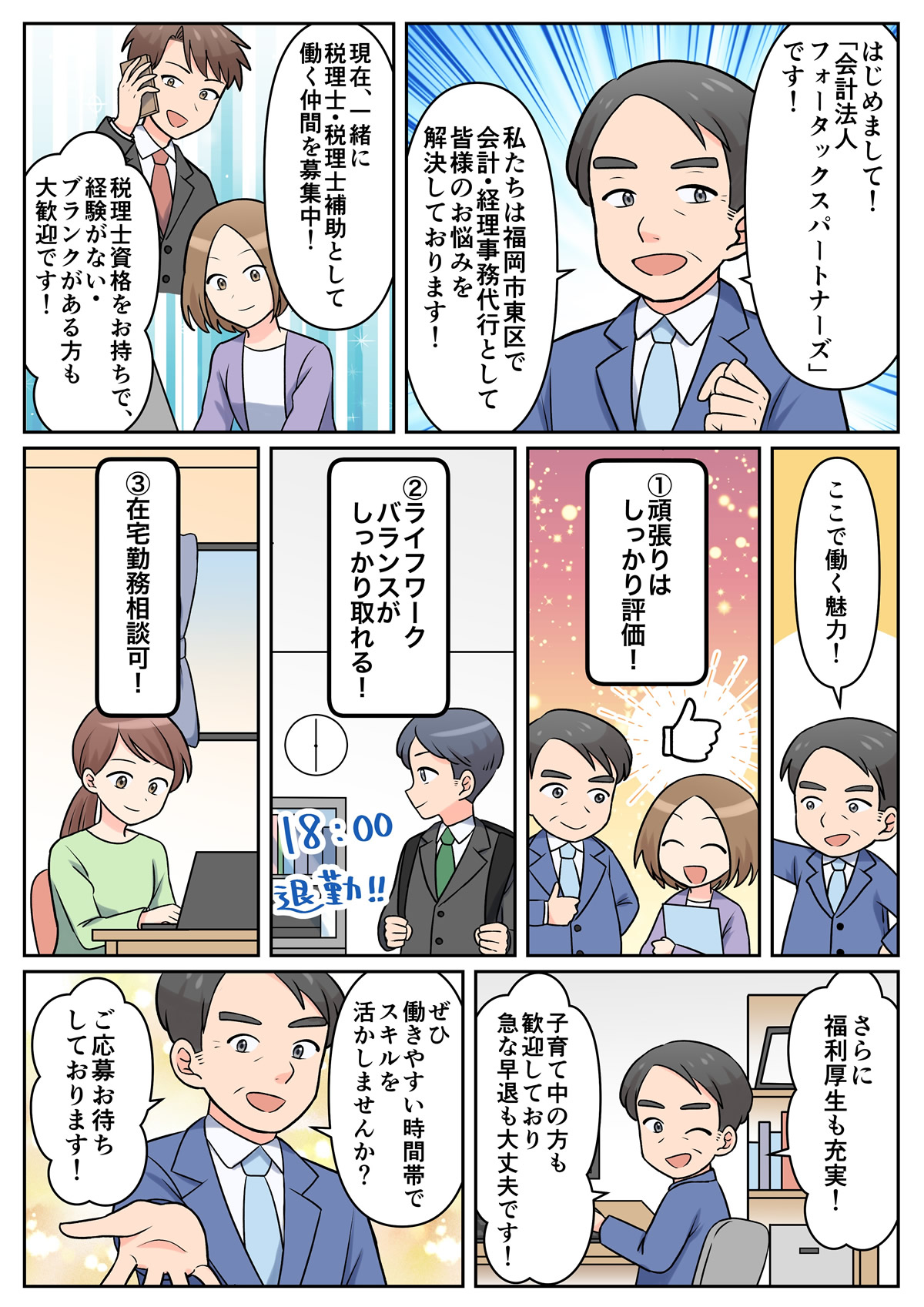 地下鉄箱崎線「馬出九大病院前」徒歩約1分の好立地にある私たち会計法人フォータックスパートナーズ。立地環境などもあり、設立時から法人・個人を問わず幅広い業界・規模のお客様の経営をバックアップしています。 開業以来、信頼と実績を積み重ね、紹介を中心に順調に成長中。今後も末永く多くの顧客の経営を支援するために今回、新たなスタッフを広く募集することになりました。